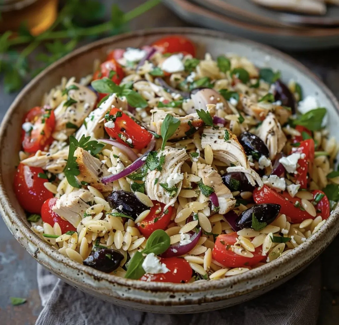 Online ordering › Greek Chicken Orzo Salad Image 1 of 1 Greek Chicken Orzo Salad from $25.00 Roasted chicken, Feta, Kalamata Olives, Spinach, red onions and orzo tossed in Mediterranean dressing Size: Select Size Single portion Family style Add To Cart Added! Roasted chicken, Feta, Kalamata Olives, Spinach, red onions and orzo tossed in Mediterranean dressing